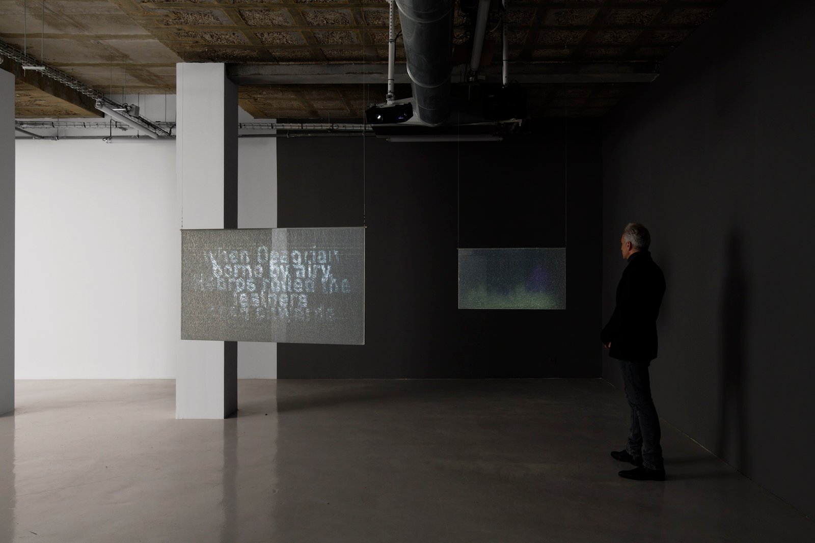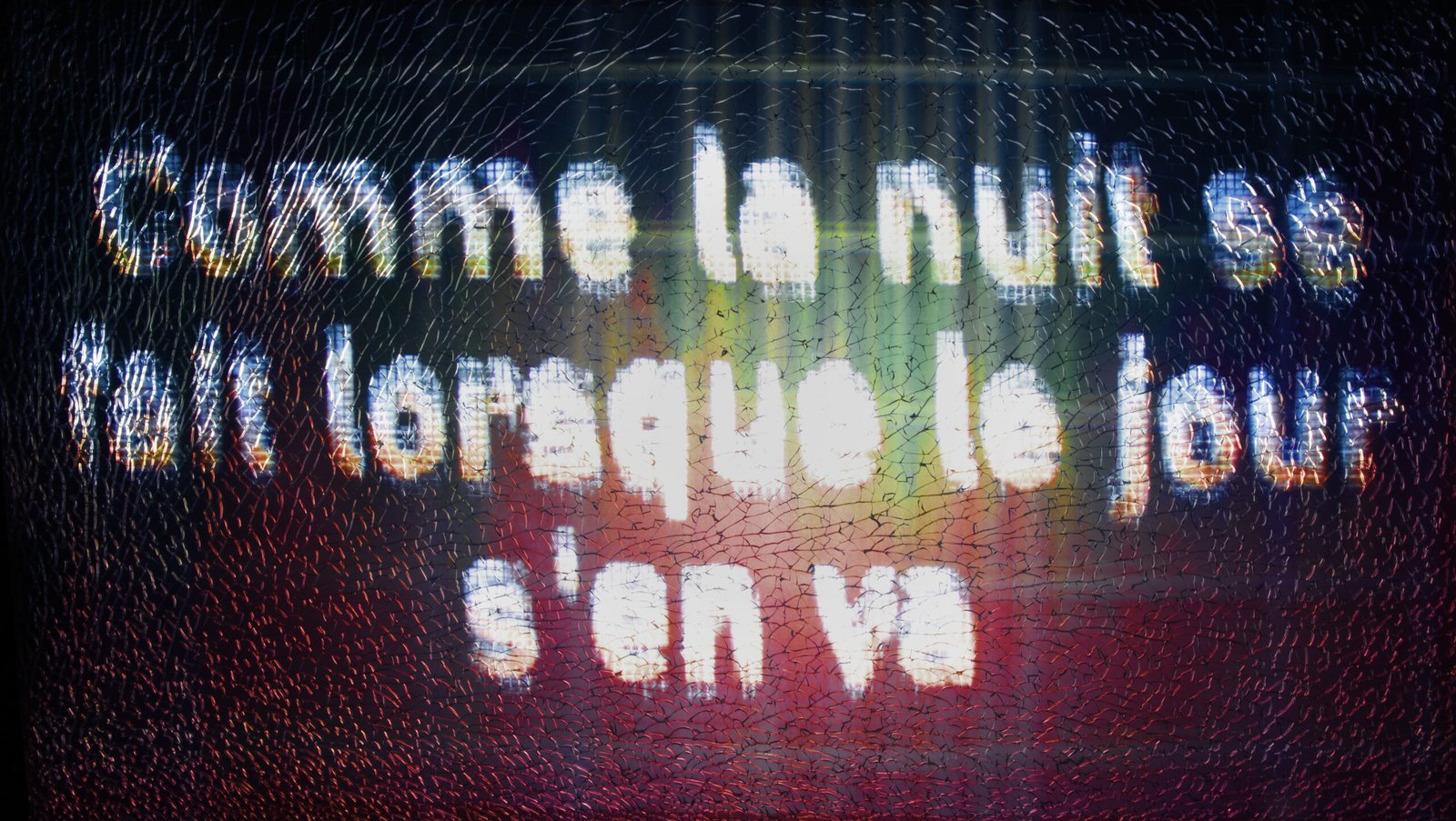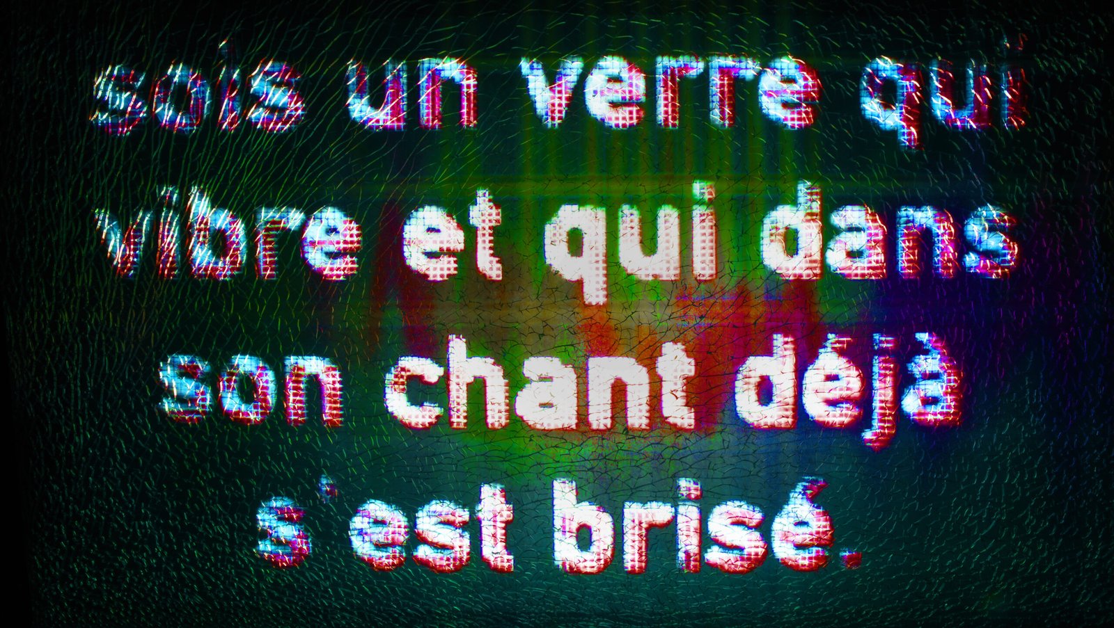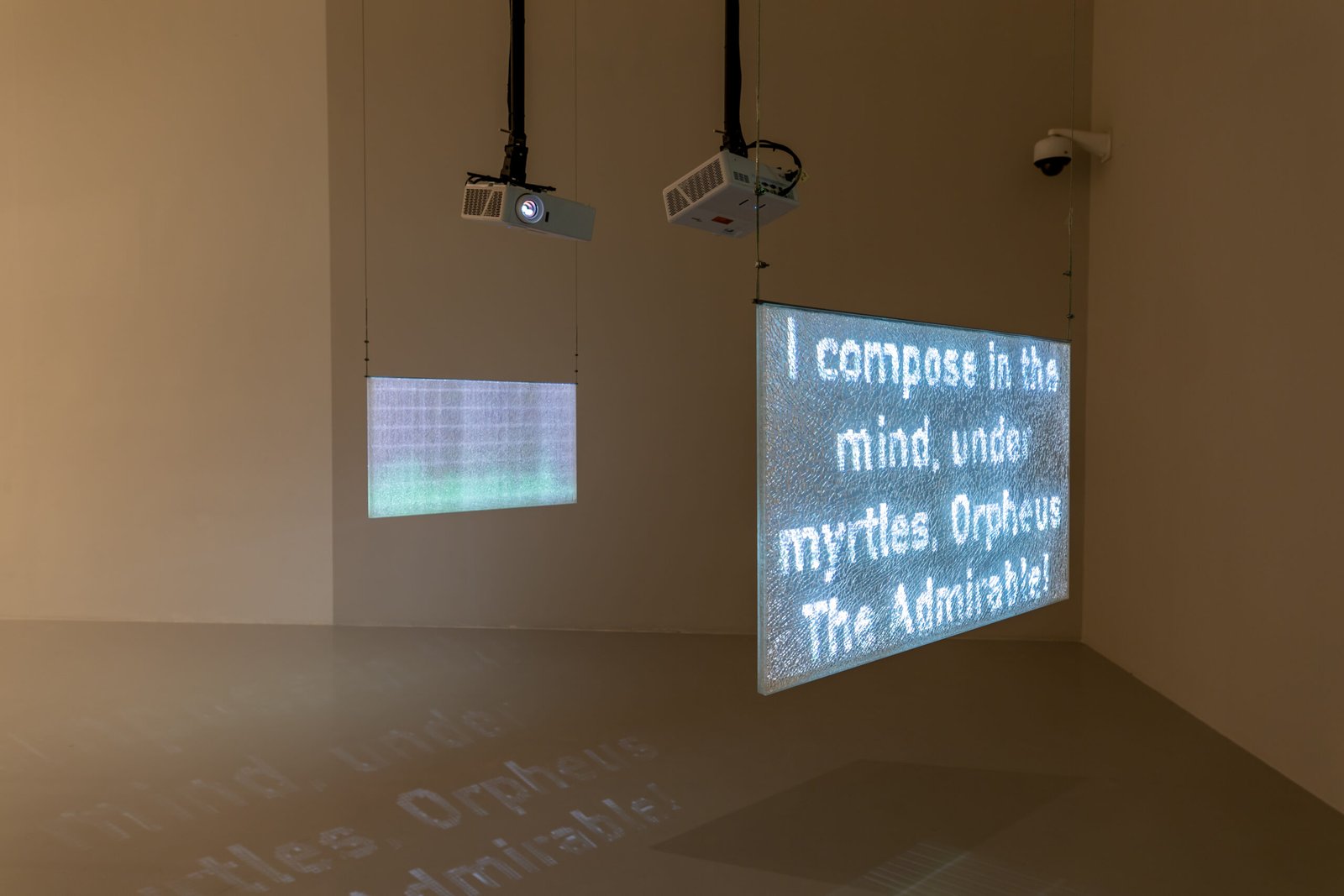 Voices, exhausted yet resolute, persist in singing in a choir of hopefulness, forming a collective tune that rises from ruins and debris. Fragments of verse, projected onto layers of broken and salvaged glass, make manifest poetry as a weapon and shield against annihilation. To quote Paul Celan,“A poem, is what says: can you hear?” Fragments of poems around Orpheus from Virgil, Ovid, Tristan l’Hermite, Johann Wolfgang von Goethe, Victor Hugo, Louise-Victorine Ackermann, Jean-Charles Leconte, Paul Valéry, Rainer Maria Rilke, Georg Trakl, Etel Adnan, Ingeborg Bachmann.