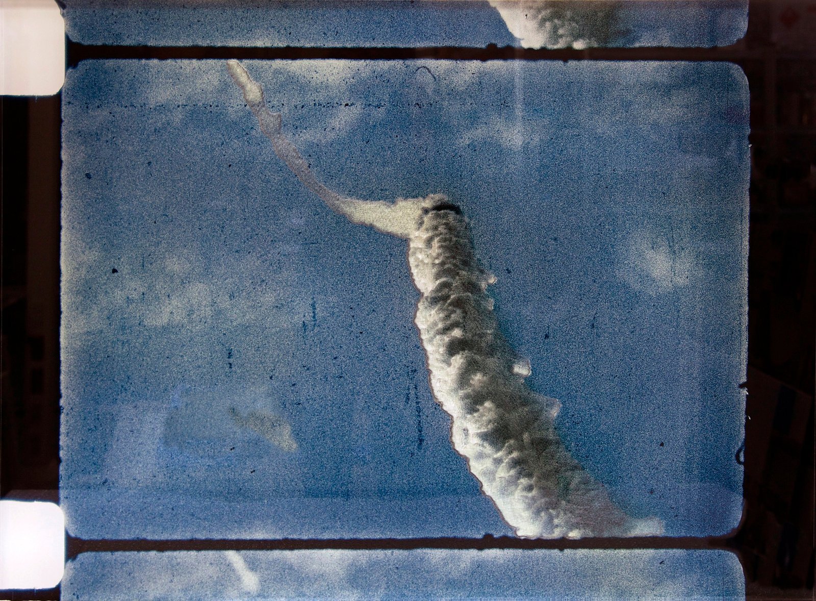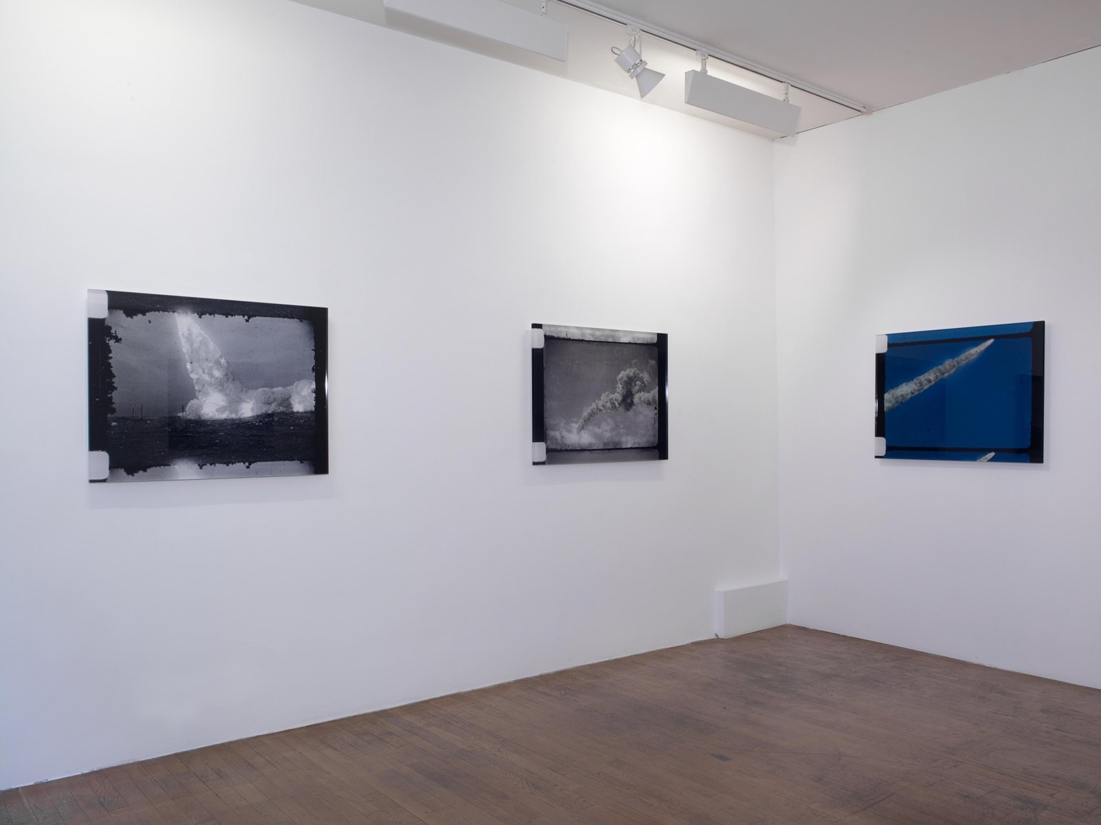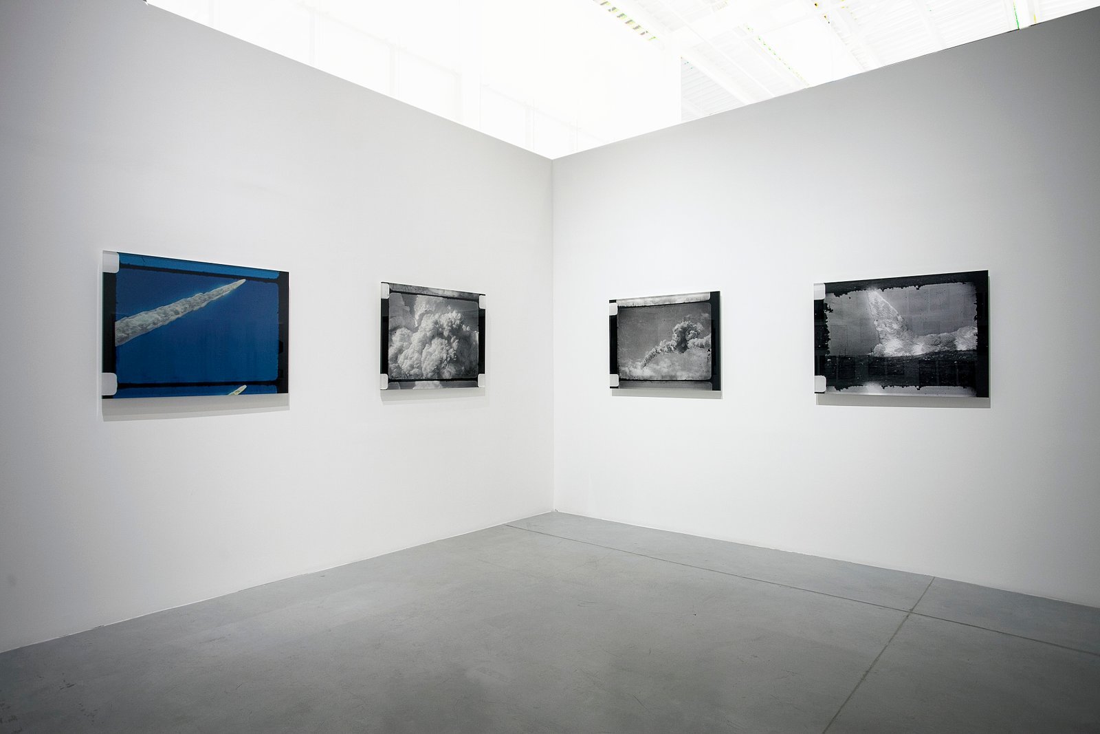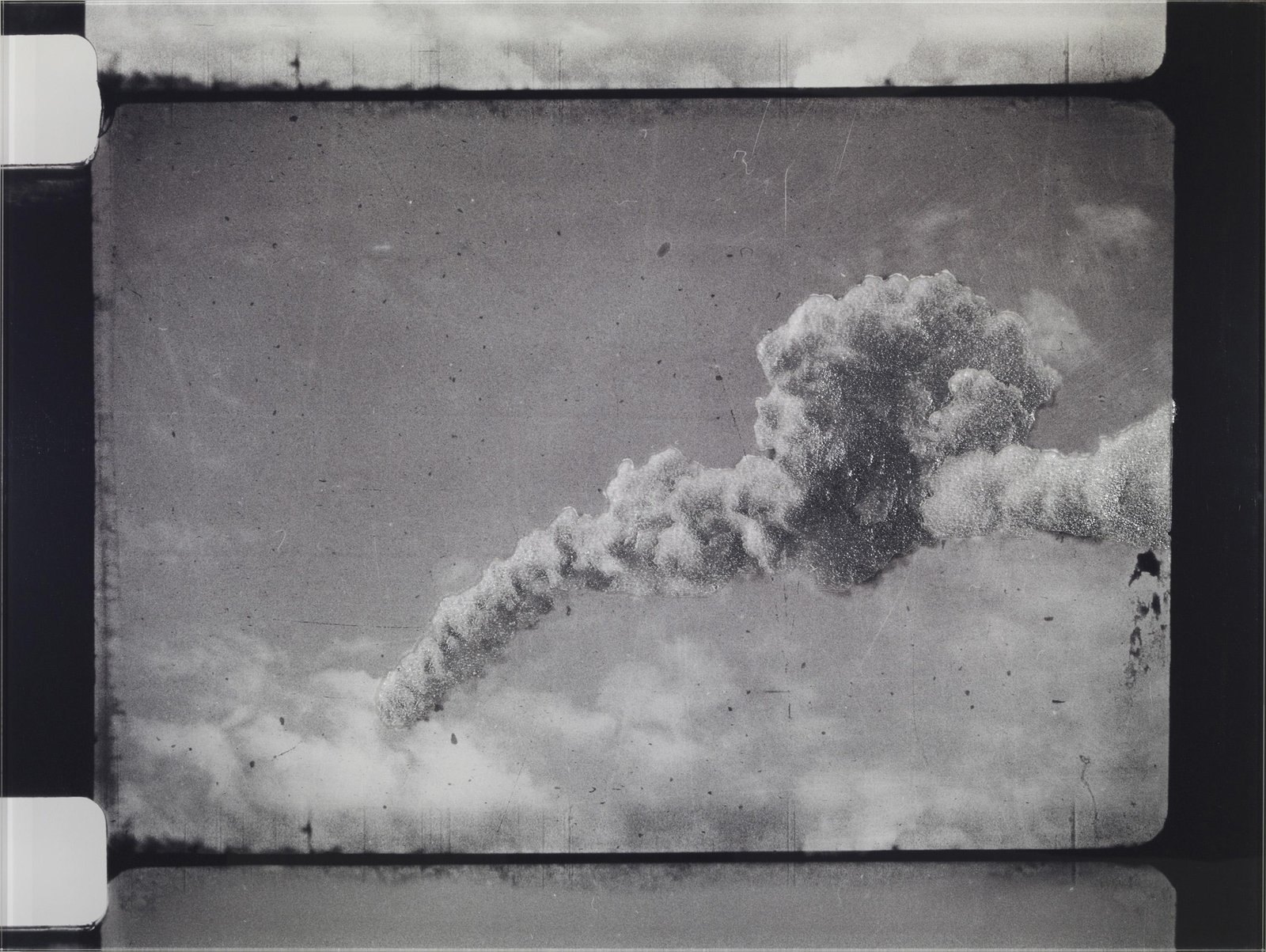 Most of the photographers and cameramen who attended the launch of the rockets missed, nearly systematically, the decisive moment – the taking off. All they managed to capture was the smoke trailing the rocket, its trace. Here, sculpted in Plexiglas in a strange form of immobility, are extracts of films, where the fleeting smoke disappears slowly, merges with the clouds, is lost amongst them… An attempt to give a material form to that immateriality.