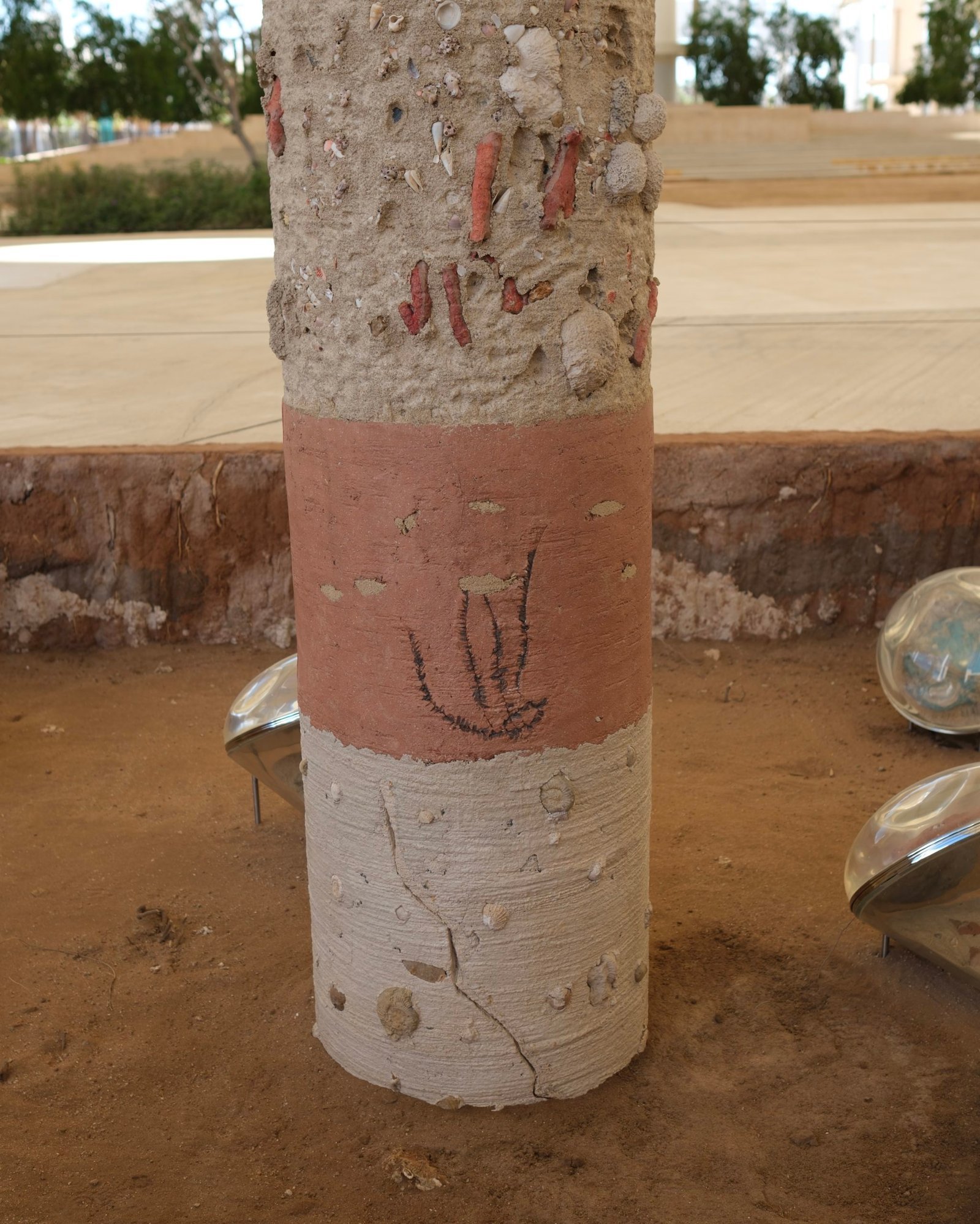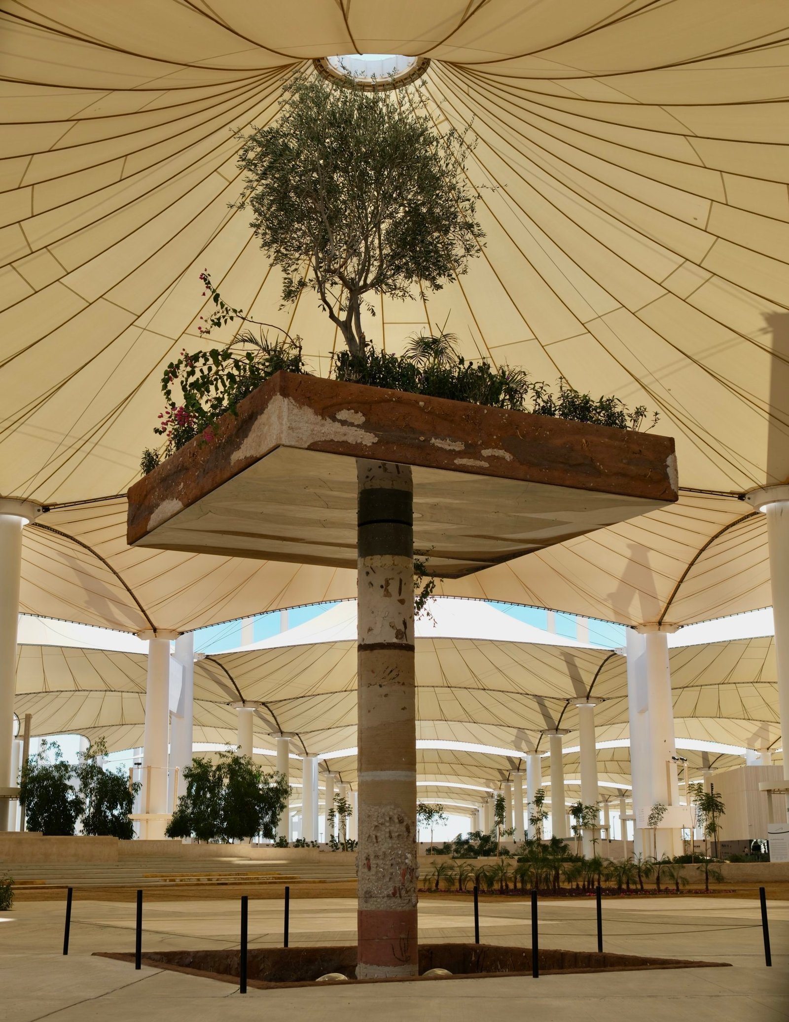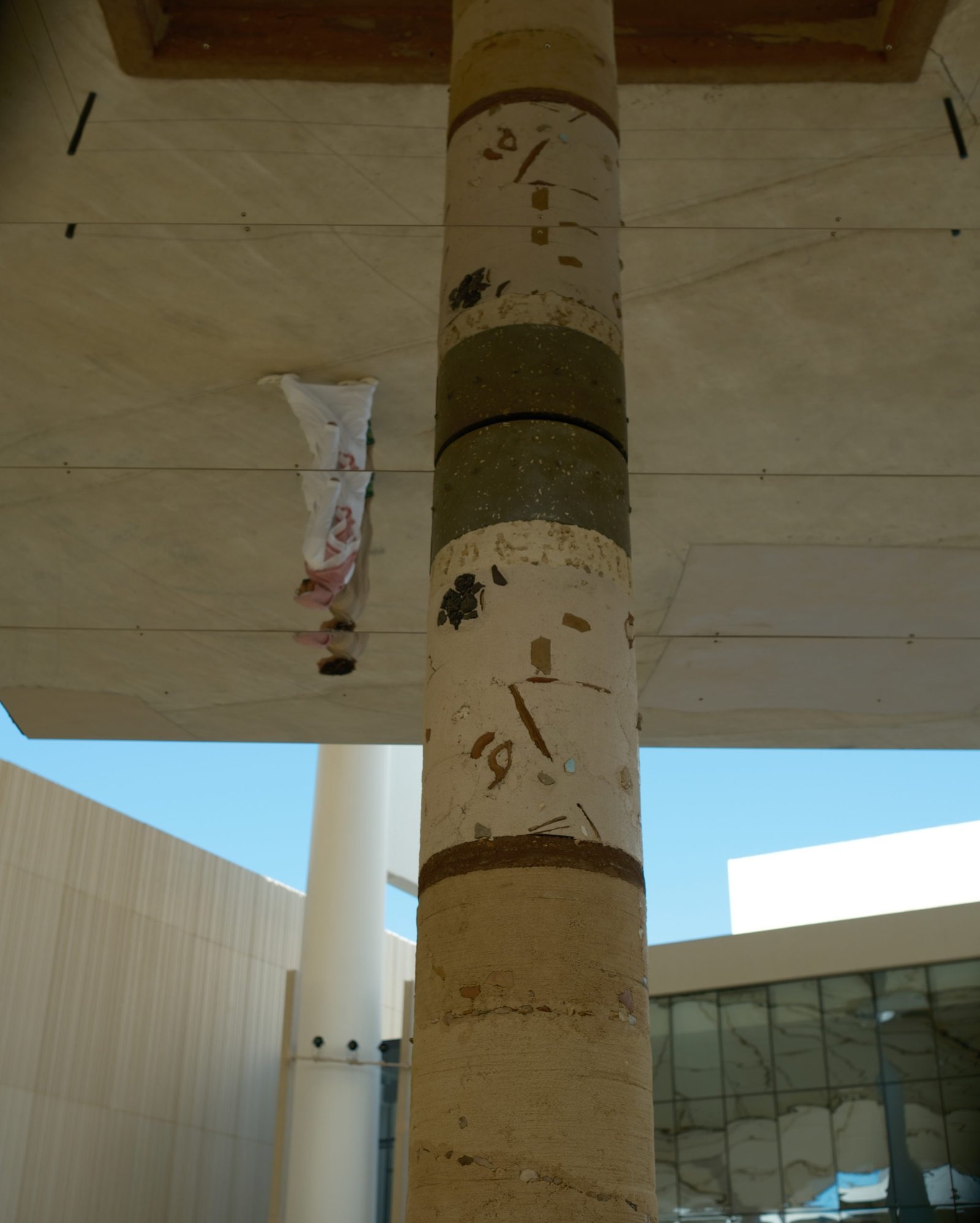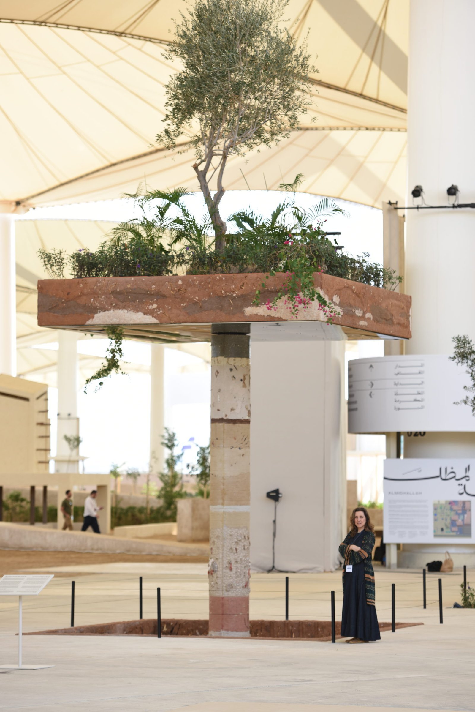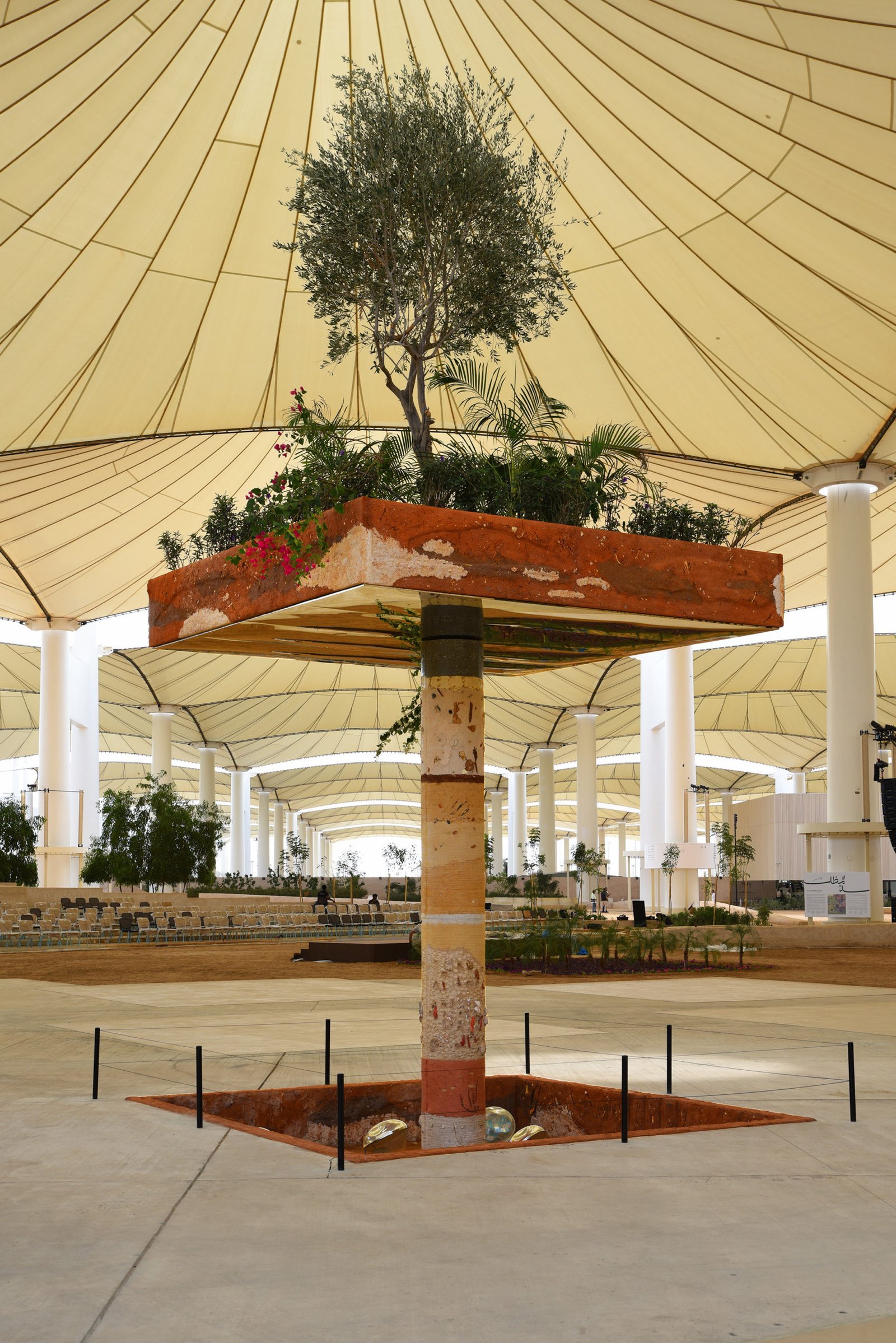 The suspended garden references soilless, hydroponic agriculture techniques and questions entanglements of context, extraterritoriality, and globalisation. It stems from the exploration of soils and subsoils and the interpretive techniques in revealing the geologic underground to uncover social histories and palimpsests beneath the ground. The raised garden is held by a column which shows the archaeological and geological as possible narratives of subsoil to visualise local timescales and processes of sedimentation. The installation evokes multiple cycles of construction, destruction, and regeneration. The artists point at the ruptures and transmissions of undergrounds where life interacts within complex ecosystems, which are sensitive to environmental and historical changes.