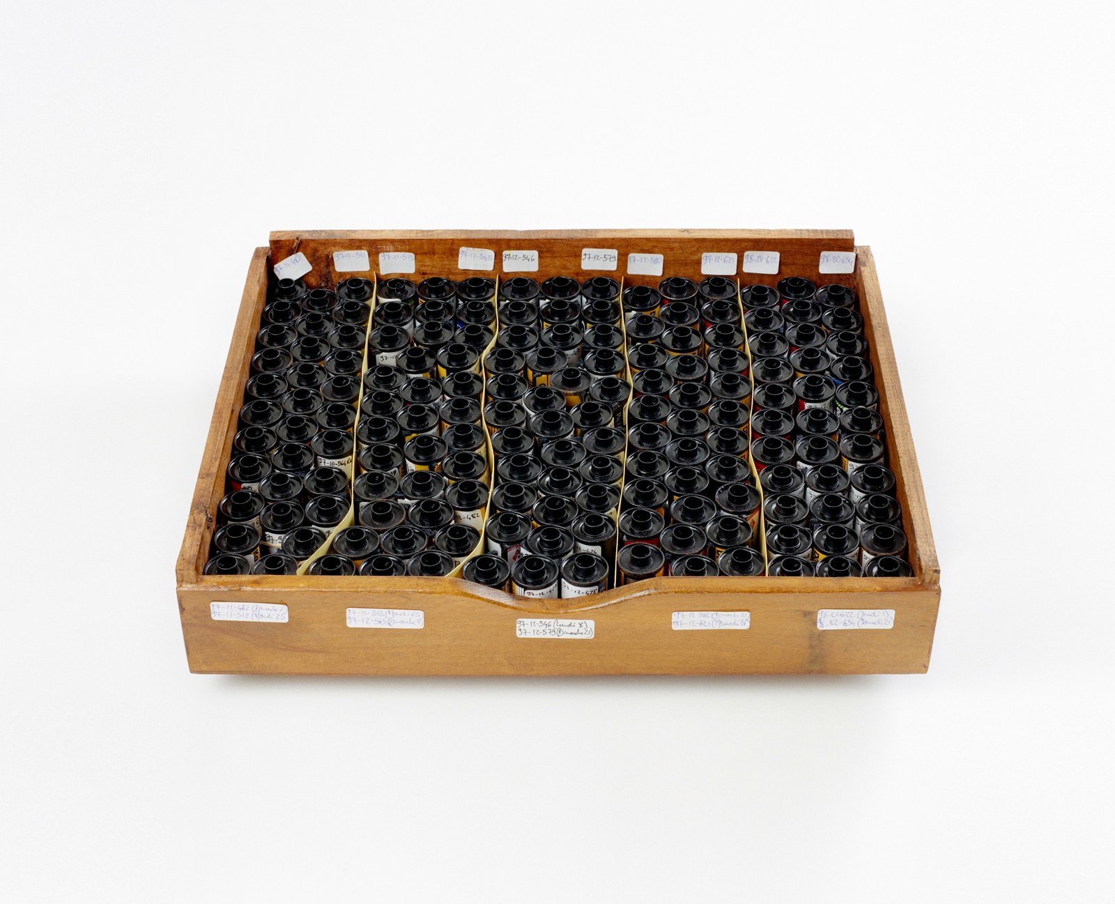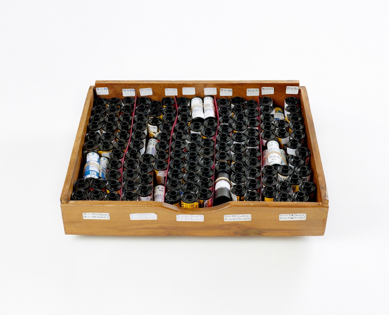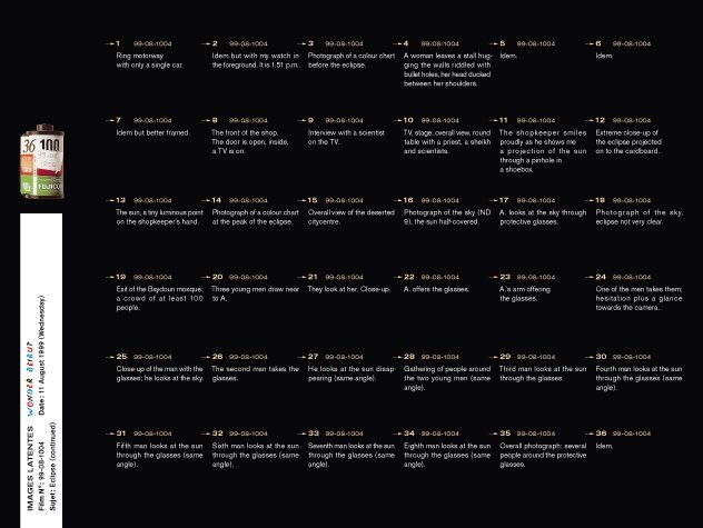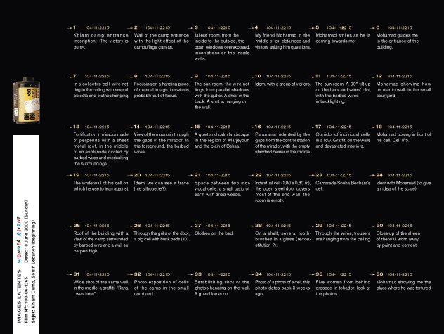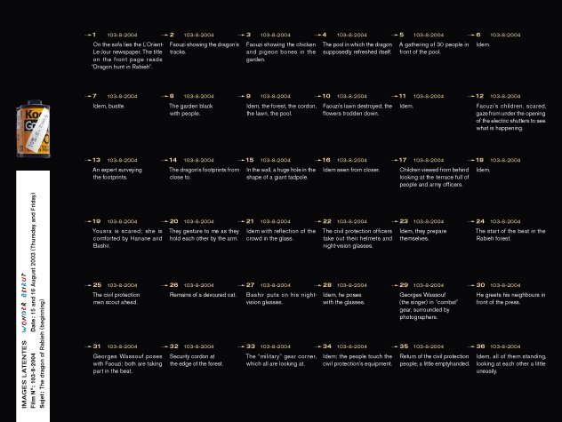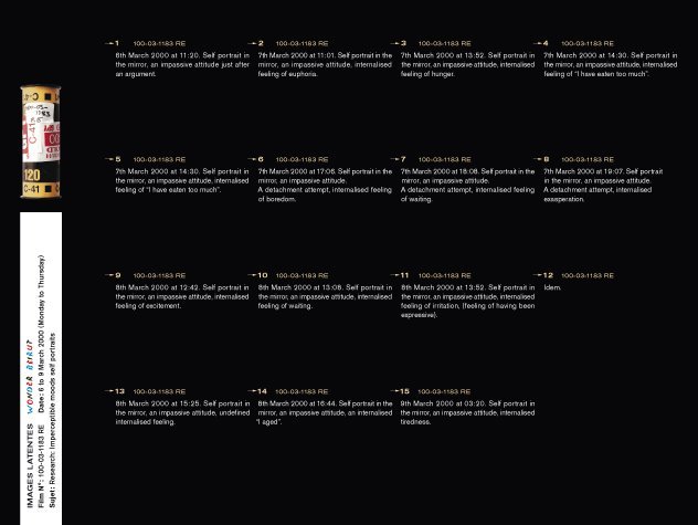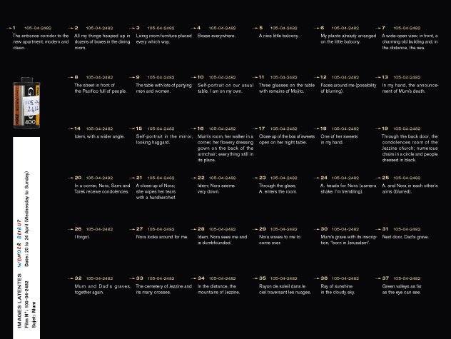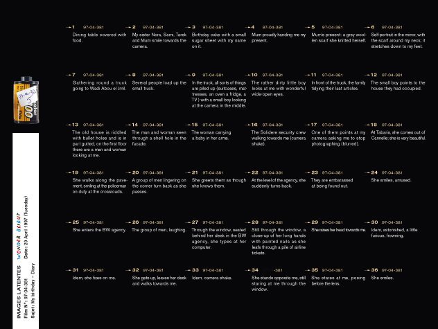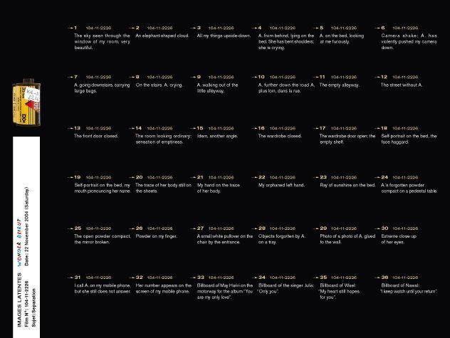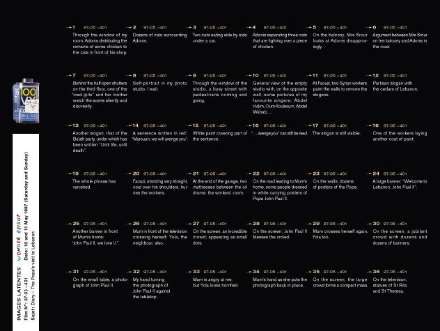 Latent Images  is the last part of the Wonder Beirut project, based on the work of a fictive photographer, Abdallah Farah. The drawers represent part of the rolls of films shot but not developed yet. Since the war years, when he was often short of products, fixatives and most of all paper, Abdallah Farah stopped developing his films, being content with taking the pictures. The rolls piled up, he felt no need to reveal them. Nevertheless, he carefully documented each photograph he took as a written description in small notebooks. His pictures, therefore, give free rein to the viewer’s imagination. The rolls of latent film, displayed as contact sheets, constitute a personal diary and a photographic investigation into the history of contemporary Lebanon. The 38 rolls selected for exhibition propose a possible narrative, relaying transformations in the city, the photographer’s personal and professional life, his lost love–but also political and socio economical changes during those years.