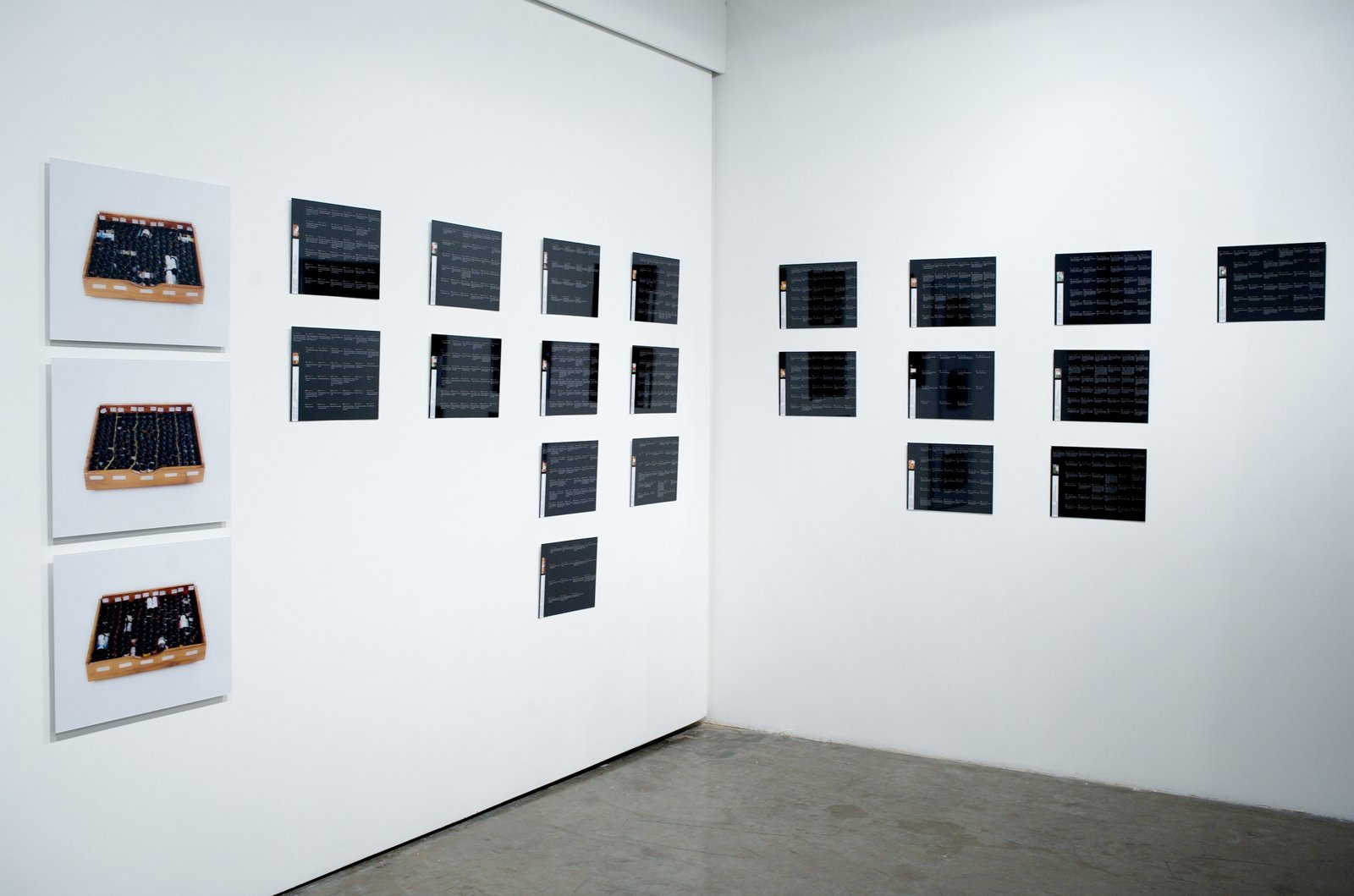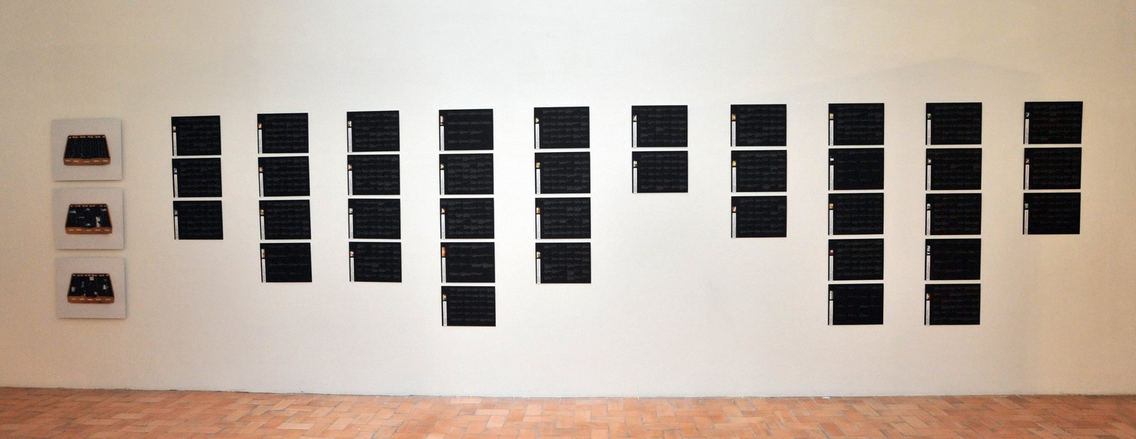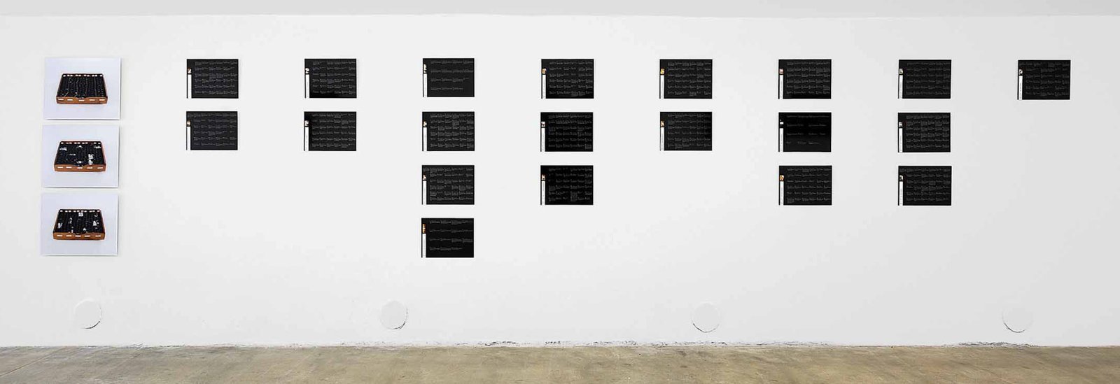 3 photographic prints on Diasec, 47 × 58 cm each, and 38 digital prints,