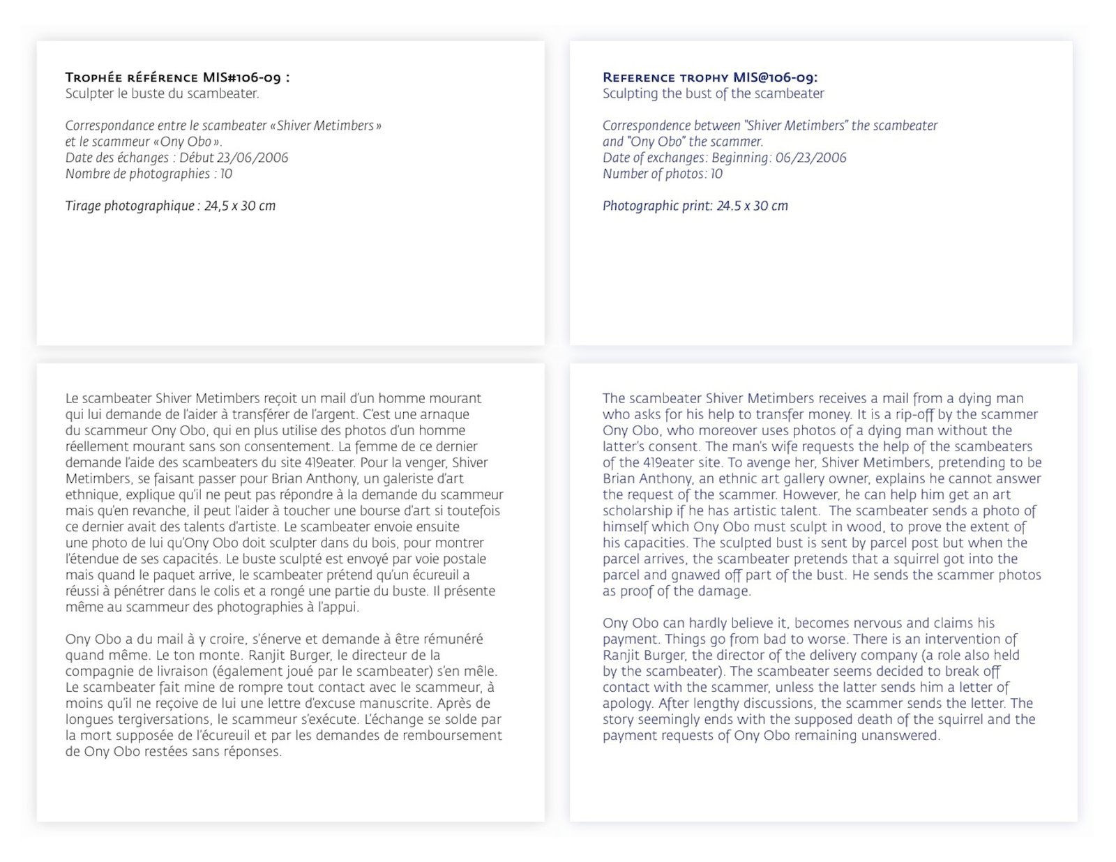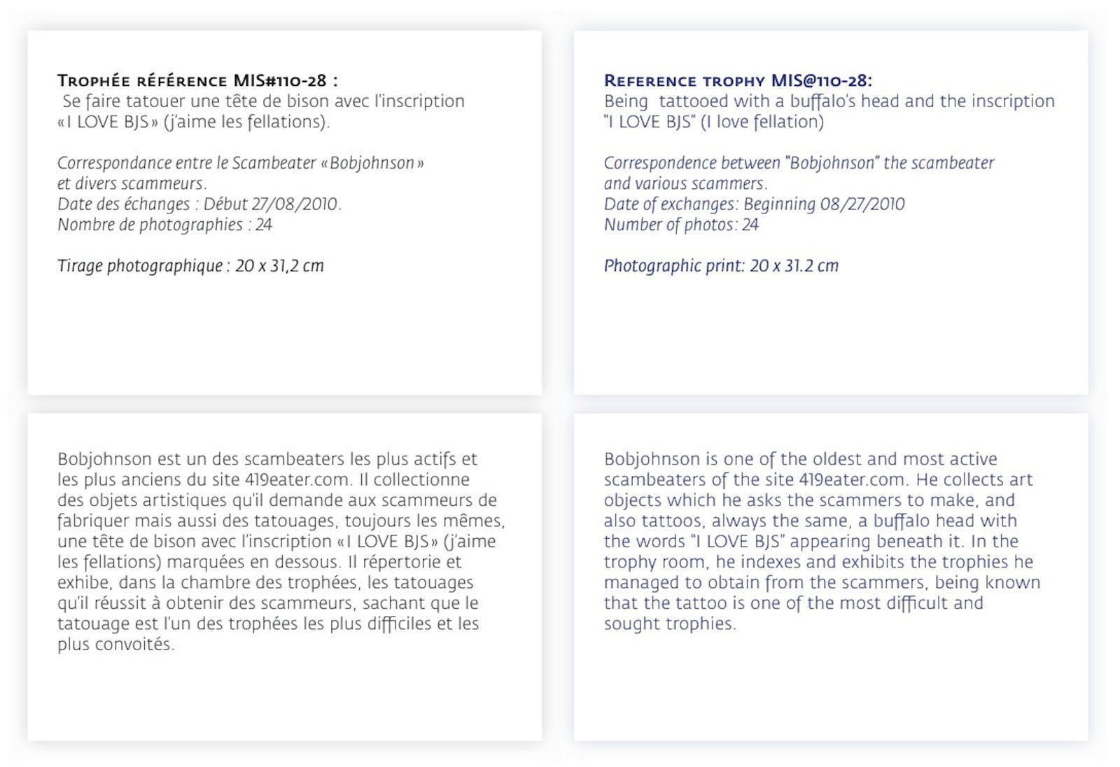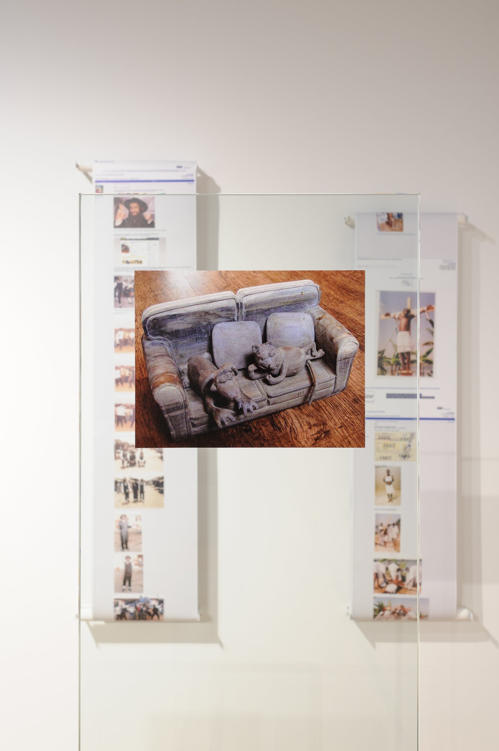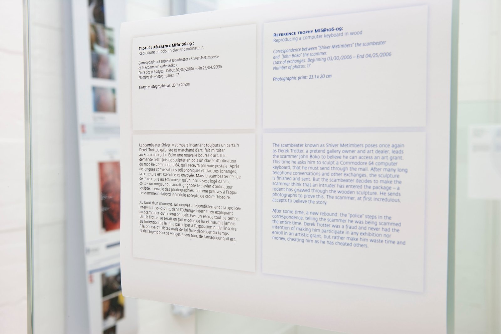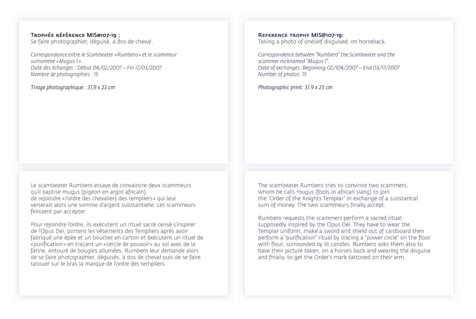 In response to these scammers, a group of individuals that call themselves scambbaiters or scambeaters, originating in the United States, have decided to fight back. Adopting a form of role-play, these individuals attempt to scam the scammers. They answer the emails, and play along with the narrative. These exchanges can last years sometimes, and their primary aim is to waste the scammers’ time. Because the 419 law in Nigeria severely punishes scammers, they operate out of Internet cafes. To waste their time is to waste their money. However, they also intend to trick the scammers and encourage them to execute various actions, at times bizarre and dreadful. This game can be very cruel, blurring the lines of credulity, abuse, power and domination, developing a strange link that shifts every role in the story. The scambeaters ask the scammers for proof of their “good faith” or motivation. They follow the same routine. Usually, this starts with a questionnaire that the scammer is requested to fill out, then assume a disguise (a knight costume, clown, rock star, Jesus Christ,…) followed by a specific demand to produce an object: for example, the scammer must paint the portrait of a dog, sculpt a wooden computer keyboard, remake a Monty Python sketch or get his arm tattooed. It is unclear whether the scammer inflicts this humiliation or physical abuse upon himself or hires someone in exchange for money. Regardless of the level of knowledge or information concerning these practices, strangely, the only remaining motivation is the will to believe. The different collected material (videos, photographs, paintings, sculptures and performances) are baptised trophies by the scambeaters, and exhibited in a “trophy room” (on the 419eater forum, for example) evoking a strange virtual museum. Twenty-three “trophies” are presented. Shown alongside them, the correspondences between scammers and scambeaters are transposed onto laminated prints. These commented exchanges are detailed by the scambeaters and bragged about, they are achievements but also adventures, epistolary novels complete with twists and suspense. The chosen scenography for The Trophy Room is an eponymous reference to Lina Bo Bardi’s creation for the Sao Paulo art museum in André Malraux’s Le Musée Imaginaire, echoing art history today, the status of artwork, its production, circulation, and diffusion.